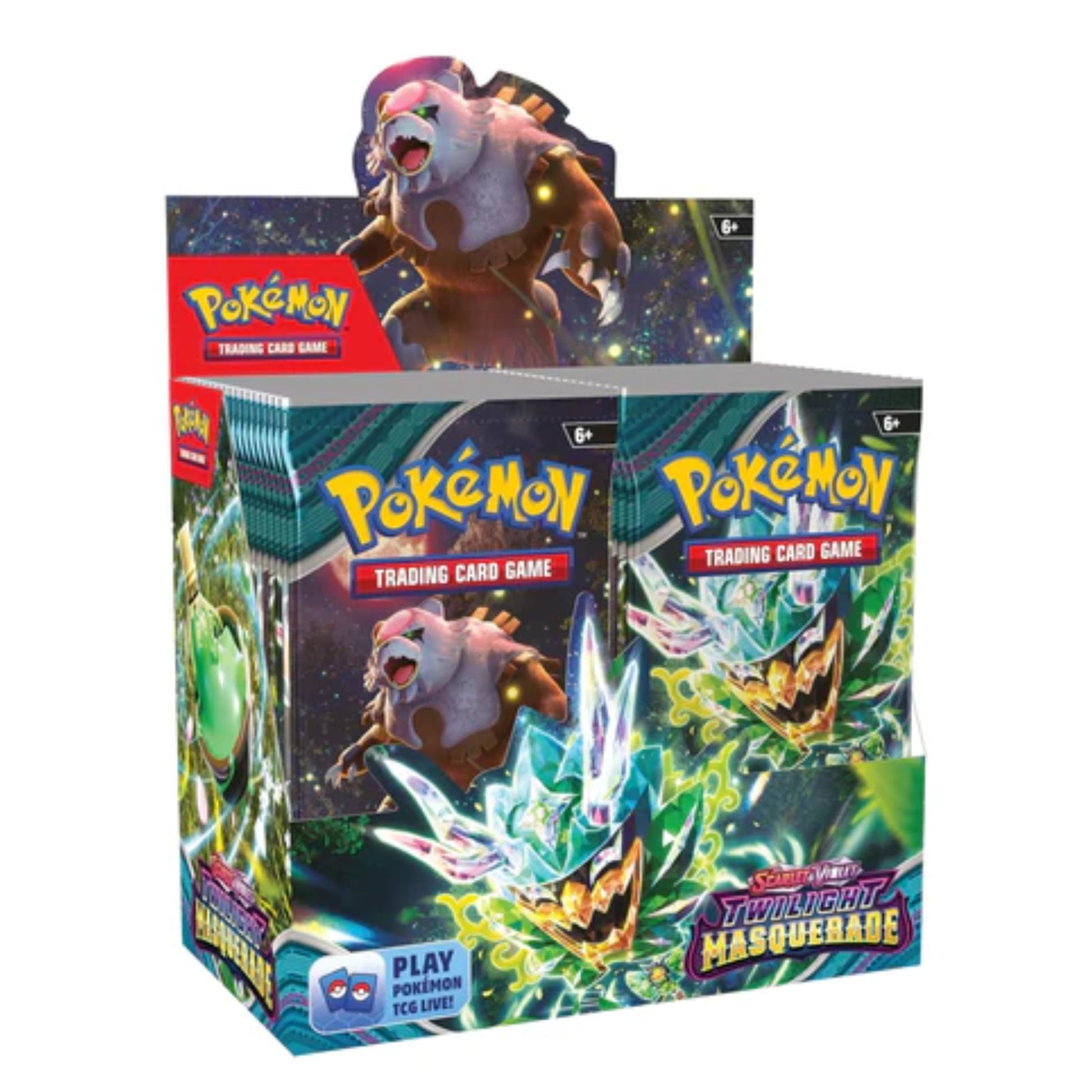 The Pokémon TCG: Scarlet & Violet Twilight Masquerade Booster Display Box includes 36 booster packs, each containing 10 game cards and 1 Basic Energy card. This set expands your collection with powerful ACE SPEC cards and features the enigmatic masked Legendary Pokémon Ogerpon in four distinct Tera forms. Key Pokémon like Bloodmoon Ursaluna ex and Sinistcha ex offer unique strategies, while the theme invites you into Kitakami—a world filled with mystery and festival excitement. Ideal for collectors seeking depth and variety within the Scarlet & Violet series.
