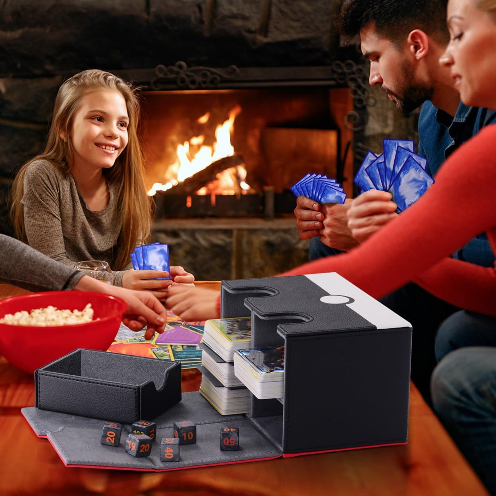 The tombert Card Deck Box is expertly designed to securely store over 380 MTG and TCG cards, including 150 double-sleeved cards. Featuring two dividers and a dedicated dice tray, it offers organized, convenient storage and quick access to your deck and accessories. Its sturdy construction in striking red and white ensures durability while keeping your collection well-protected during transport or play.
